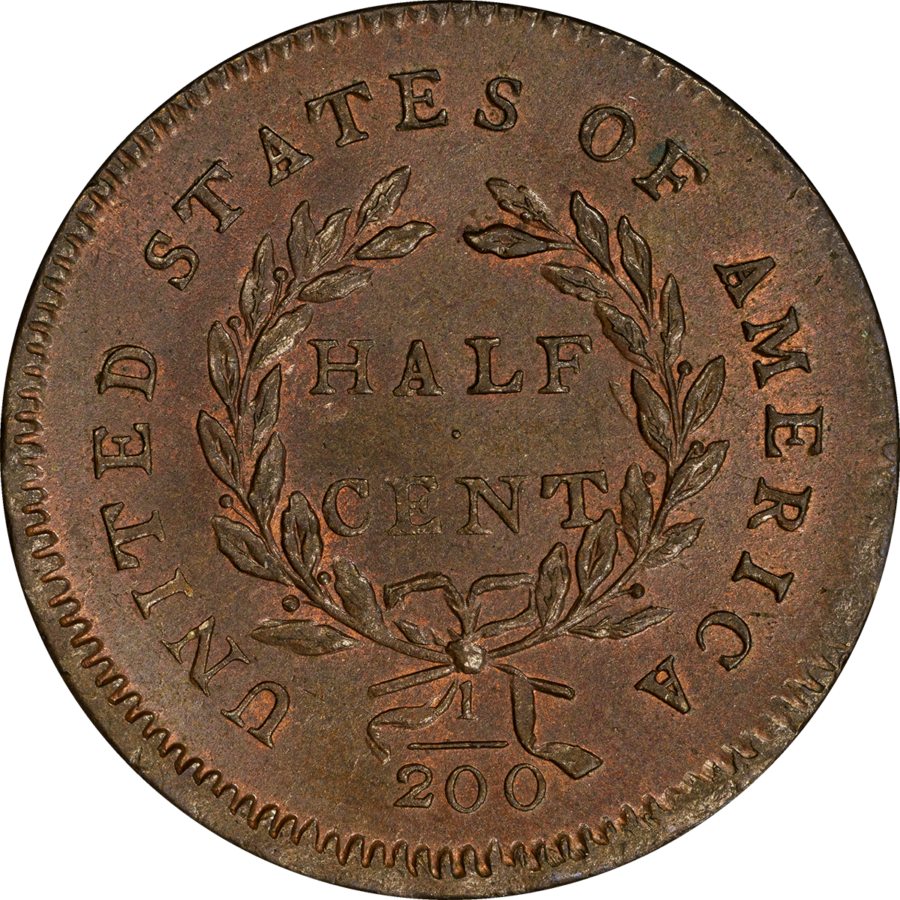 Three 1794 Half Cent reverses were paired with this single “High Relief” obverse, including B.7 (C.7), with a slender reverse wreath similar to 1794 Cents, B.8 (C.8) with a heavy reverse wreath and T in CENT leaning right, and this B.9 (C.9).