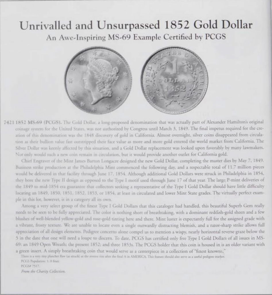 "Unrivalled and Unsurpassed 1852 Gold Dollar"
